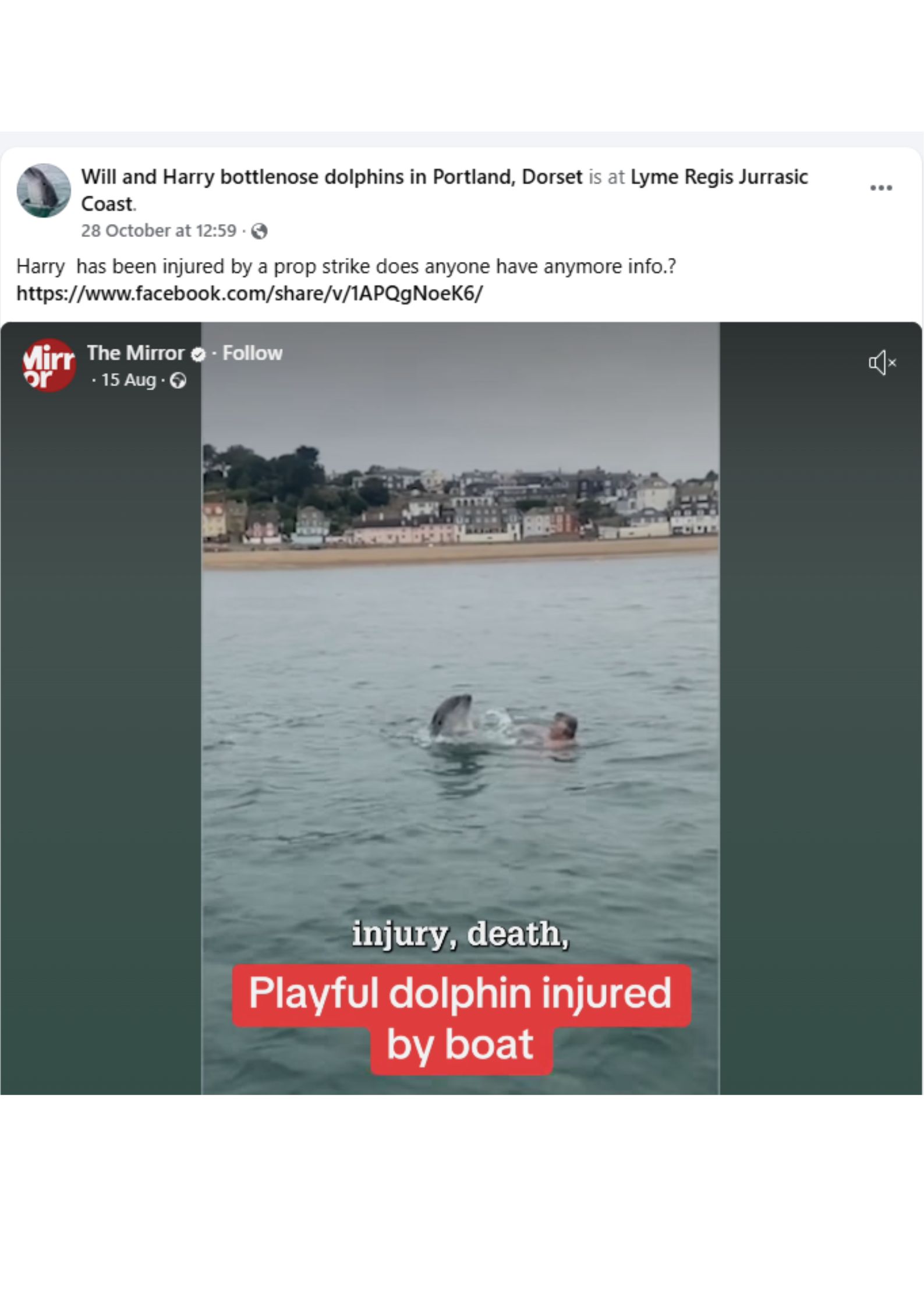 Aggressive behaviour has been seen more recently in ‘Harry’, mentioned earlier as East coast Scotland dolphins ‘Honey’ and ‘Whipper-Snapper’, aka Harry and Will in Portland, Dorset. In Summer 2025, Harry travelled 50 miles along the Dorset coast and started displaying aggression towards swimmers. Experts in the area are very concerned for Harry’s welfare following an increase in people jumping in the water to be with him, and in October he was injured by a boat propeller.Â