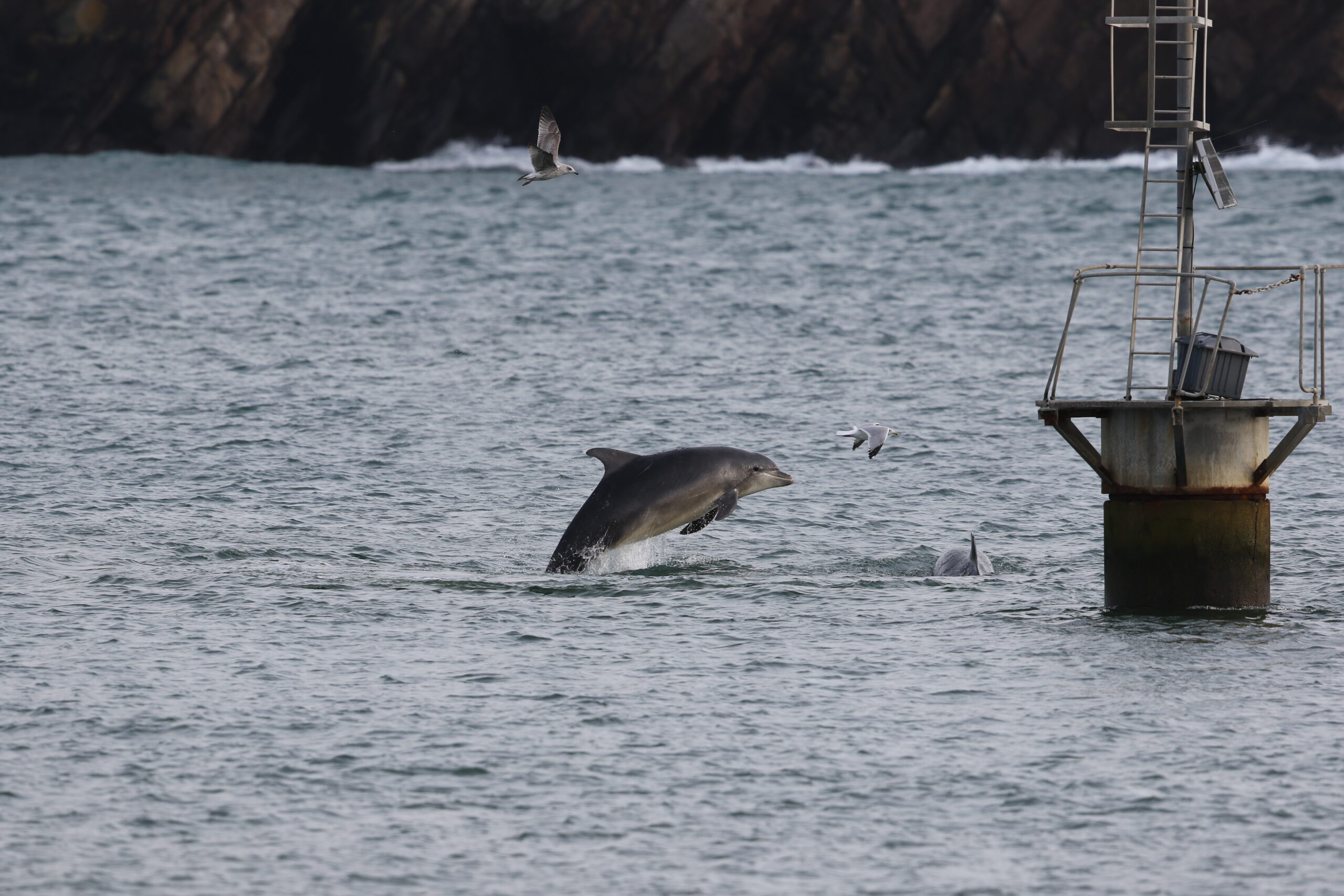In bottlenose dolphins, specific behavioural traits are known to be passed down from one generation to the next. These include social, play, and hunting techniques. In the east coast of Scotland population, bottlenose dolphins regurgitate salmon, and flip them in the air, to allow for headfirst swallowing. We see Moonlight and Starlight doing the same in Manx waters with various species of large fish. These learned behaviours are a sign of high intelligence and strong social bonds.